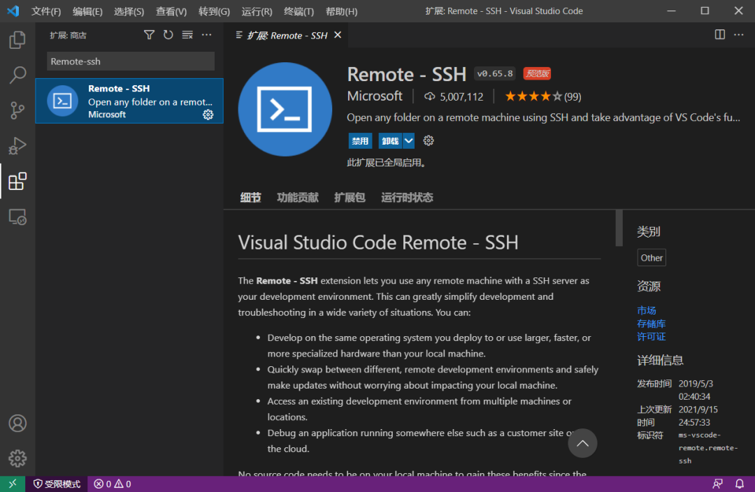 打开Vs Code,插件商店搜索Remote-SSH安装即可