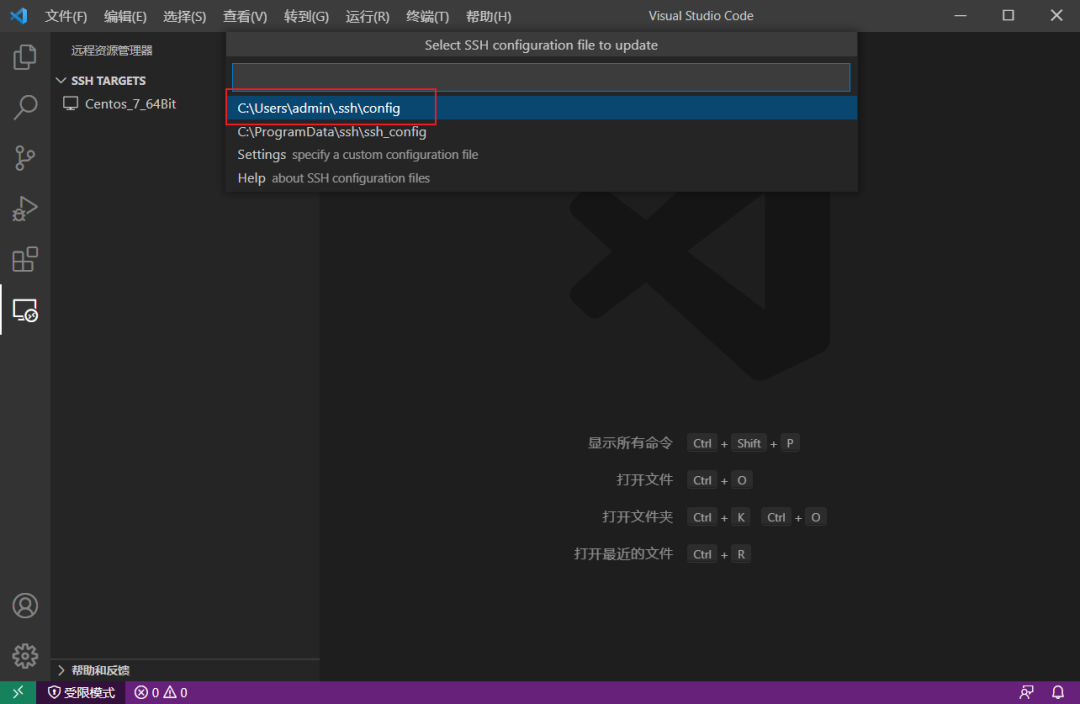选择左侧小电脑,然后点击小齿轮,在弹出的选项中选择第一个即可。如图,第一个就表示将会把远程Linux服务器的连接地址以及用户信息保存在C:\Users\admin\.ssh\config路径下。