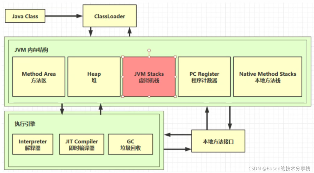上图为JVM内存结构概况图,本篇博客我们将来探究JVM中的虚拟机栈(图片来自课程截图)