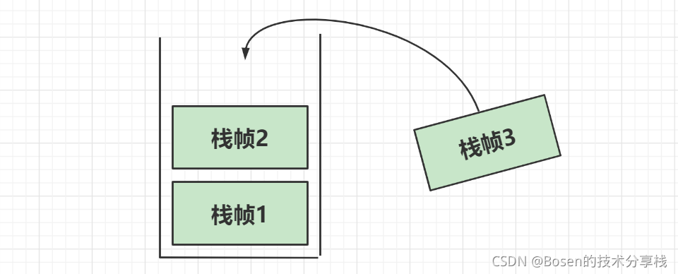 同样的,虚拟机栈与数据结构中的栈相同,保持了**“先进后出,后进先出”**的结构特点。就如同手枪弹夹中的子弹,后装入弹夹的子弹会比先装入的先上膛并发射出去,而“子弹”在栈中也有一个专有名词——栈帧,并且每个线程只能有一个活动栈帧,对应着当前正在执行的那个方法。(下图是栈的示意图)