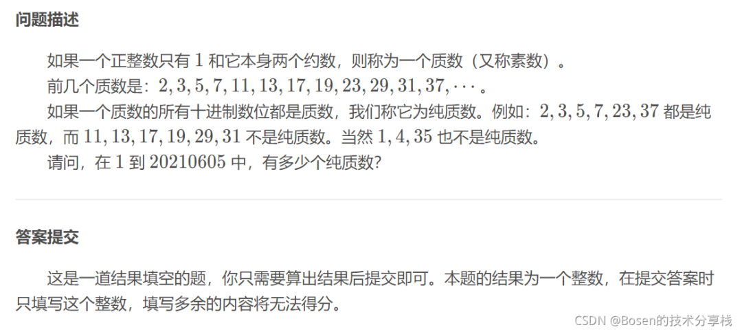 import java.util.*;public class Main {public static void main(String[] args) {int n = 20210605;int count = 0;int[] vs = new int[n+1];Set<Integer> set = new HashSet<>();for(int i = 2; i <= n; i++) {if (vs[i] == 0) {set.add(i);for(int j = i+i; j <= n; j += i) {vs[j] = -1;}}}for(int i : set) {char[] chars = String.valueOf(i).toCharArray();boolean flag = true;for(char c : chars) {if (!(c == '2' || c == '3' || c == '5' || c == '7')) {flag = false;break;}}if (flag) {++count;}}System.out.println(count);}}