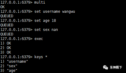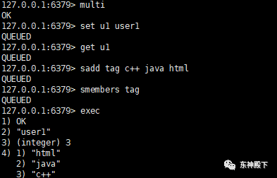 以下是一个事务的例子,它先以MULTL开始一个事务,然后将多个命令入队到事务中,最后由EXEC命令触发事务,一并执行事务中的所有命令:
