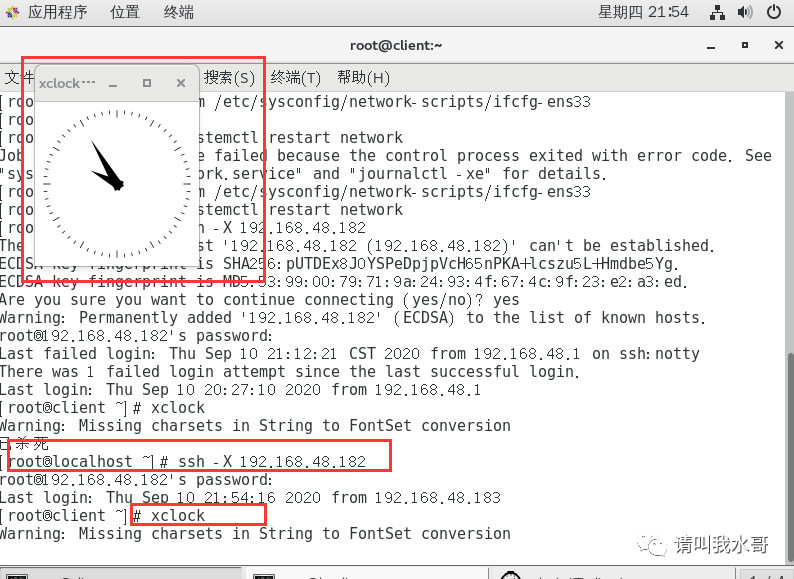 1.为了模拟,还是使用xclock这个小玩意2.把 X Client端的X窗口显示在 X Serve 端需要先行在 X Client端指定 X Server的位置,这个使用要使用DISPLAY变量(X Client端使用)[root@client ~]# export DISAPLAY=192.168.48.183:10.03.开启X协议转发[root@localhost ~]# ssh -X 192.168.48.183 //注意转发的目标端一定要有X Server,否则会报错输入密码:进入[root@client ~]# xclock截图如下