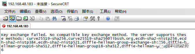 我这里没有xshell6,使用SecureCRT测试下:(也是报错,报错内容也是缺少DH密钥交换算法)