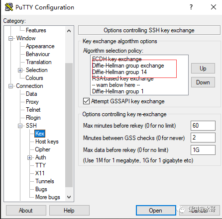 直接再下载最新版的putty做测试,可以看到有密钥交换算法,证明是可以登陆的,登陆测试下
