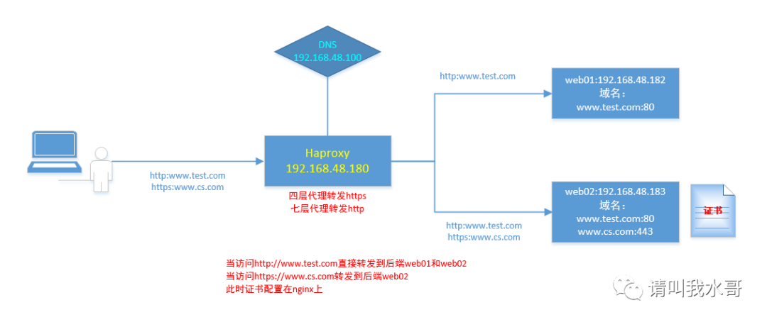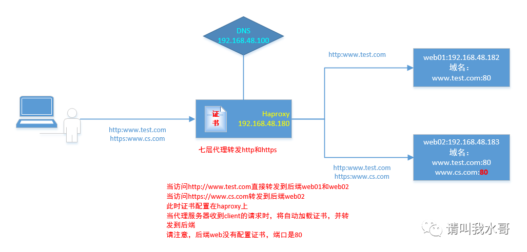 1. haproxy本身提供ssl证书,客户端访问的时候自动加载ssl证书,然后通过七层转发规则,转发到后端web