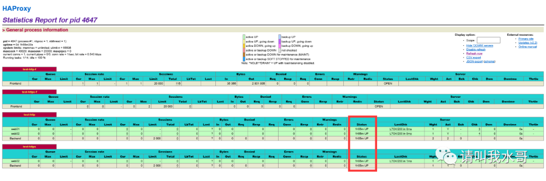 [root@haproxy conf]# cp haproxy.cfg haproxy.cfg.bak[root@haproxy conf]# cat haproxy.cfgglobalmaxconn 20000ulimit-n 65535 //设置每个进程的文件描述符,默认情况下,自动计算的,建议手动设置大小。log 127.0.0.1 local0uid rootgid rootchroot /usr/local/haproxy //修改为haproxy的安装目录nbproc 1 //只创建一个进程,推荐的模式操作daemon //进程到后台运行,推荐模式pidfile /run/haproxy.piddefaultslog global //配置为全局日志,会收到启动和推出,以及所有代理的日志mode httpbalance roundrobinretries 3option redispatchstats uri /haproxystats refresh 30sstats realm haproxy-statusstats auth admin:123456statu hide-versiontimeout connect 5000 //设置服务器连接尝试成功等待的最大时间。timeout client 50000 //设置客户端的最大不活动时间 毫秒,建议和服务器超时相等timeout server 50000 //设置服务器端的最大不活动时间。option httpchk GET /index.html//http代理配置frontend test-http-fbind :80mode httpoption httplogoption dontlognull //禁止或禁用空连接的日志记录(没有数据传输的连接不会记录日志,主要是为了避免对后端server进行端口扫描和探测的日志太多)option forwardforoption httpclose //HAProxy将关闭与服务器的连接,当收到请求和响应时,立即发送给客户端acl test_1 hdr_beg(host) -i www.test.comuse_backend test-http test_1backend test-httpmode httpbalance roundrobinoption httpcloseoption forwardforretries 2option redispatch //在连接失败的情况下启用或禁用会话重分发(就是cookie指定的服务器宕机,客户端一直保持访问,这个参数会破坏持久性,重新分配到新的服务器)server web01 192.168.10.182:80 weight 1 check inter 2000 rise 3 fall 5server web02 192.168.10.183:80 weight 1 check inter 2000 rise 3 fall 5//https代理配置frontend test-https-fmode tcp //tcp代表四层代理,http代表七层代理bind *:443 //代理443端口default_backend test-https //转发到后端组backend test-httpsmode tcp //tcp代理server web02 192.168.48.183:443//配置文件检查[root@haproxy conf]# haproxy -c -f haproxy.cfgConfiguration file is valid//日志配置[root@haproxy conf]# vim /etc/rsyslog.conf$ModLoad imudp$UDPServerRun 514local0.* /var/log/haproxy.log[root@haproxy haproxy]# systemctl restart rsyslog.service//在启停haproxy的日志如下[root@haproxy ~]# tailf /var/log/haproxy.logAug 24 14:12:14 localhost haproxy[11016]: Proxy test-proxy started.Aug 24 14:12:14 localhost haproxy[11016]: Proxy test-proxy-srv started.