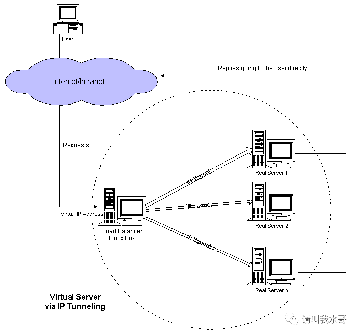 首先,让我们看一下通过IP隧道传输的虚拟服务器的示意图。通过IP隧道的虚拟服务器与通过NAT的虚拟服务器的最大不同之处在于:负载均衡器通过IP隧道向真实服务器发送请求,而NAT模式是通过网络地址转换向真实服务器发送请求。
