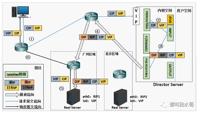 请注意,真实服务器可以在任何网络中具有任何真实IP地址,可以在地理位置上分布,但是它们必须支持IP封装协议。它们的隧道设备都已配置完毕,以便系统可以正确地解封装收到的封装数据包,并且<Virtual IP Address>必须配置在非arp设备或非arp设备的任何别名上,或者可以将系统配置为将<虚拟IP地址>的数据包重定向到本地套接字(就是APR抑制的问题)