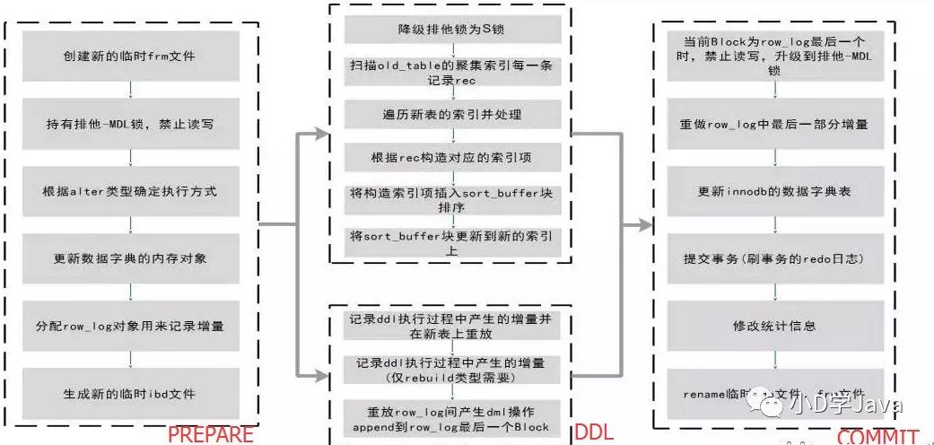 online ddl主要包括3个阶段,prepare阶段,ddl执行阶段,commit阶段.