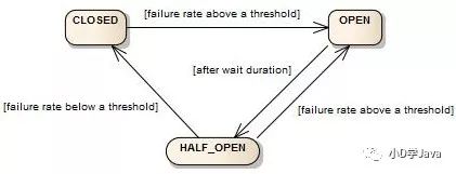 状态时,熔断器允许少量请求通过并且此时会使用另外一个状态环来计算失败率,若失败率低于或等于阈值则熔断器状态变为CLOSED