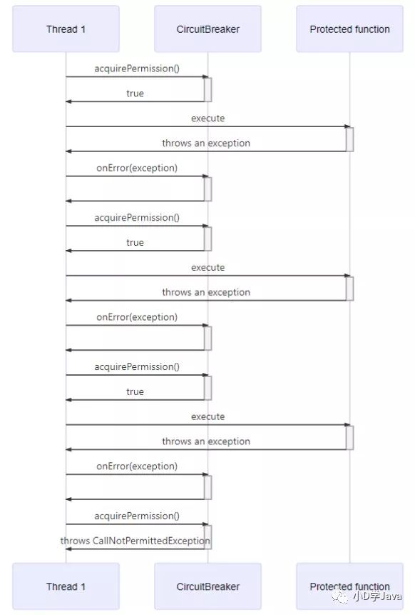 package tinys.breaker;import io.github.resilience4j.circuitbreaker.CircuitBreaker;import io.github.resilience4j.circuitbreaker.CircuitBreakerConfig;import tinys.listener.StatusChangeEvenConsumer;import tinys.service.RandomValService;import java.time.Duration;/*** 描述 : 熔断器测试类* 2019/8/2*/public class CircuitBreakerTest {public static void main(String[] args) {CircuitBreaker circuitBreaker = CircuitBreaker.of("breaker",initCircuitBreakerConfig());//声明一个状态变化回调,状态类如上CircuitBreaker.EventPublisher ep = circuitBreaker.getEventPublisher().onStateTransition(new StatusChangeEvenConsumer());//注册事件的监听//registerEventCallback(circuitBreaker);//执行多次来触发熔断恢复断开等流程for (int i = 0; i < 30; i++) {try {Thread.sleep(100L);//在熔断器内执行业务方法circuitBreaker.executeRunnable(()->RandomValService.get());//这个是只执行的lambdacircuitBreaker.executeSupplier(()-> RandomValService.get());//这个是可获取到值的lambda}catch (Exception e){System.out.println(e);}}}/*** 熔断状态监听*/private static void registerEventCallback(CircuitBreaker circuitBreaker) {//监听事件circuitBreaker.getEventPublisher().onEvent(event -> System.out.println("触发事件-->" + event));//选择性监听事件circuitBreaker.getEventPublisher().onSuccess(event -> System.out.println("触发成功事件-->" + event)).onError(event -> System.out.println("触发失败事件-->" + event));}/*** 声明熔断器配置参数*/private static CircuitBreakerConfig initCircuitBreakerConfig() {return CircuitBreakerConfig.custom().failureRateThreshold(50) //90%的失败率则触发熔断,默认50%.ringBufferSizeInClosedState(5) //半熔断时环的容量大小,默认为10.enableAutomaticTransitionFromOpenToHalfOpen() //自动从OPEN切换到HALF_OPEN//设置当断路器处于HALF_OPEN状态下的ring buffer的大小,它存储了最近一段时间请求的成功失败状态,默认为10.ringBufferSizeInHalfOpenState(10)//用来指定断路器从OPEN到HALF_OPEN状态等待的时长,默认是60秒.waitDurationInOpenState(Duration.ofSeconds(1)).recordExceptions(RuntimeException.class) //设置统计的异常,其它异常不统计.build();}}