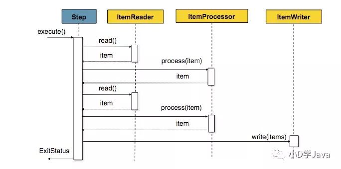 <!-- 一个对应上图的配置文件--><beans:beans xmlns="http://www.springframework.org/schema/batch"xmlns:beans="http://www.springframework.org/schema/beans"xmlns:xsi="http://www.w3.org/2001/XMLSchema-instance"xsi:schemaLocation="http://www.springframework.org/schema/beanshttp://www.springframework.org/schema/beans/spring-beans.xsdhttp://www.springframework.org/schema/batchhttp://www.springframework.org/schema/batch/spring-batch-2.2.xsd"><!--定义一个job--><job id="ioSampleJob"><!--定义一个步骤--><step id="step1"><!--定义一个数据流--><tasklet><!--定义读写器以及每次批量读取的数据量--><chunk reader="itemReader" writer="itemWriter" commit-interval="2"/></tasklet></step></job></beans:beans>
