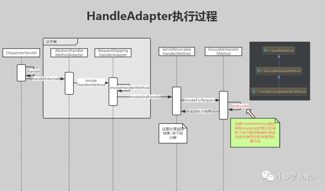 public class HandlerMethod {public HandlerMethod createWithResolvedBean() {Object handler = this.bean;//如果HandlerMethod的bean是字符串,则从bean工厂获取if (this.bean instanceof String) {String beanName = (String) this.bean;handler = this.beanFactory.getBean(beanName);}return new HandlerMethod(this, handler);}//内部构造方法private HandlerMethod(HandlerMethod handlerMethod, Object handler) {this.bean = handler;this.beanFactory = handlerMethod.beanFactory;this.beanType = handlerMethod.beanType;this.method = handlerMethod.method;//注意这个属性,是之后执行业务逻辑方法位置的依据this.bridgedMethod = handlerMethod.bridgedMethod;this.parameters = handlerMethod.parameters;this.responseStatus = handlerMethod.responseStatus;this.responseStatusReason = handlerMethod.responseStatusReason;this.resolvedFromHandlerMethod = handlerMethod;}}