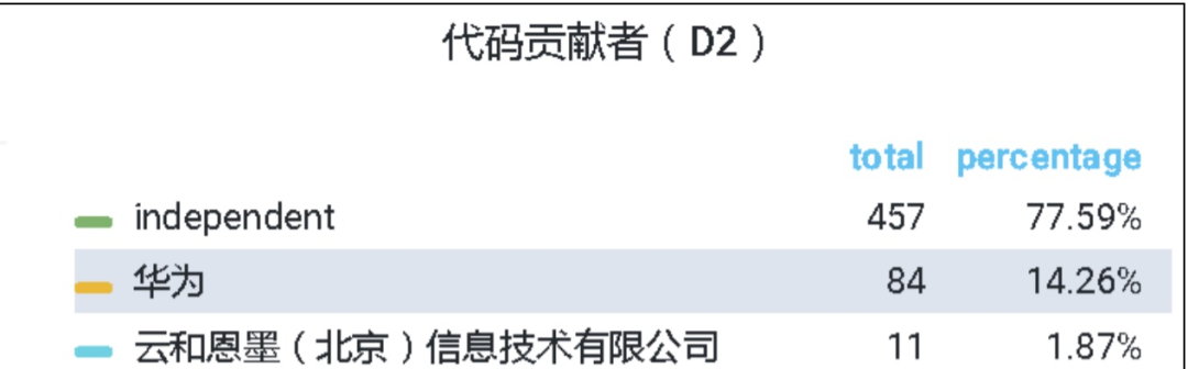 根据社区理事会的统计数据,云和恩墨在开源社区的代码合入量紧随华为,在合作伙伴中位列第一,在过去一年中,共有11个人参与社区贡献并合入了代码。下图展示了代码贡献者(D2)维度的统计数据。