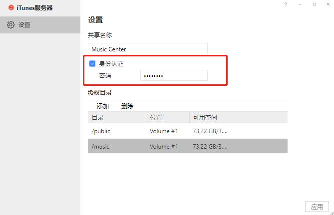 5.如需设置iTunes 服务器的访问密码,请勾选身份认证,并填写密码;