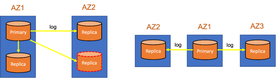 一种是两AZ有三副本,其中AZ1有两副本,AZ2有一个副本;若是四个副本,那么AZ2会再多一个副本,以此保证AZ1挂了之后AZ2还能有足够多的副本。