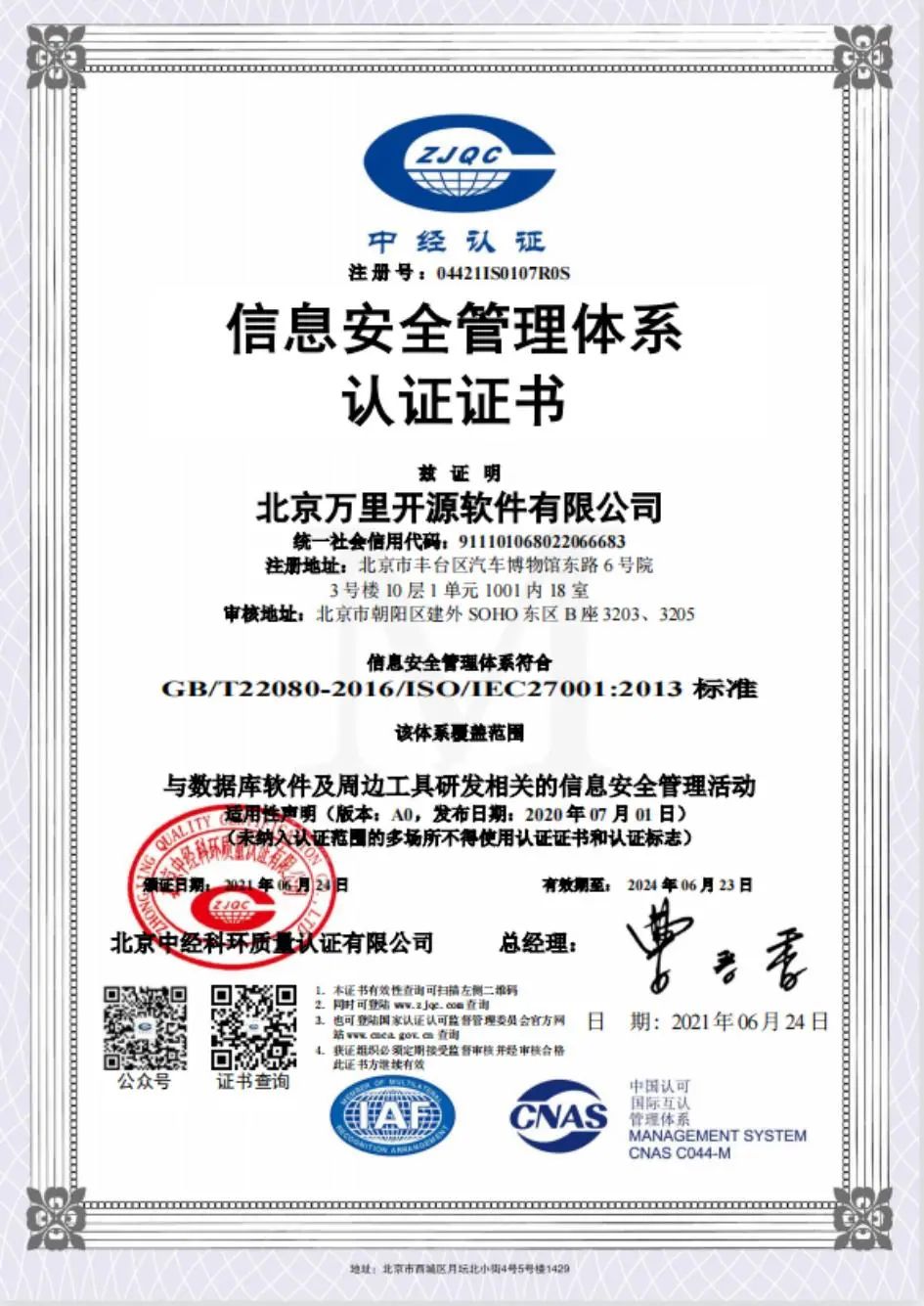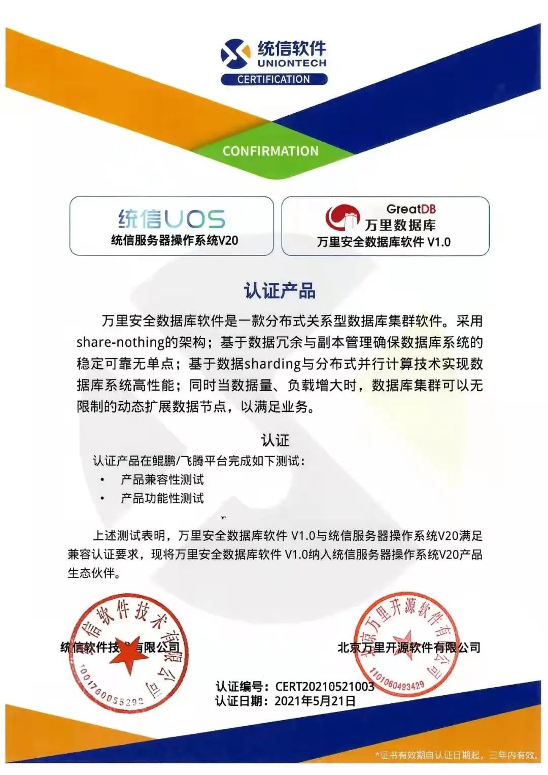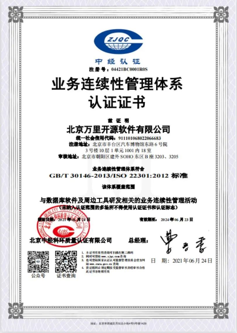 资质认证方面,万里数据库是首批完成金融分布式数据库验证测试的国产数据库单位,通过了四川信创中心权威评测,接连通过ISO27001信息安全管理与ISO22301业务连续性管理双认证。