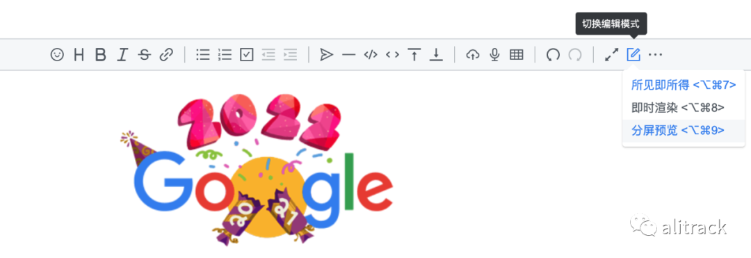 支持三种编辑模式:所见即所得(wysiwyg)、即时渲染(ir,类似 Typora)、分屏预览(sv)