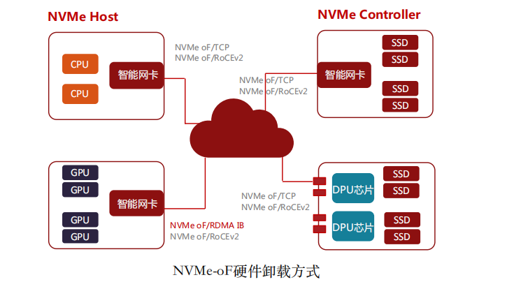 NVMe支持Host端(Initiator或Client)和Controller端(Target或Server),目 前DPU智能网卡硬件加速的场景中,包括如下四中情况: