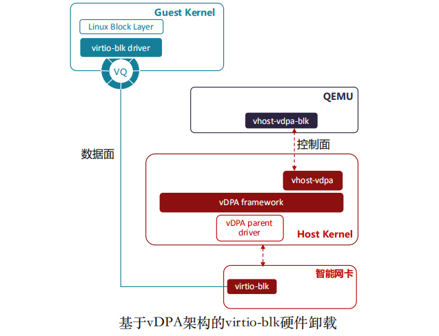 由于virtio机制通过硬件实现加速已经是通用做法,所以利用这个优势,virtio-blk卸载到硬件,已经是必然趋势。在智能网卡中,将virtio-blk到后端映射到如NVMe-oF的远端磁盘上,这样相比较当前virtio-blk的用法,不需要在主机系统中挂载很多的远端NVMe磁盘,由智能网卡直接完成映射,更加安全。