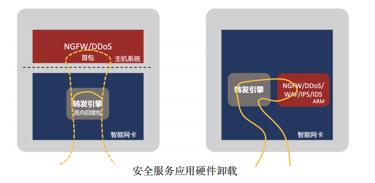 由于安全功能产品对报文处理的深度不同,有些只需要在二至四层处理,有些则需要在七层进行处理,所以在智能网卡的卸载方式上,也存在不同。如NGFW和DDoS等设备,可以通过流表卸载的方式,对流量进行拦截,来加速运行在主机系统中的安全服务应用。如IPS/IDS等,需要对报文内容做深度检测, 则可以通过in-line的方式将数据深度检测功能卸载到智能网卡的CPU上,这时需要智能网卡的CPU具有较强的性能。