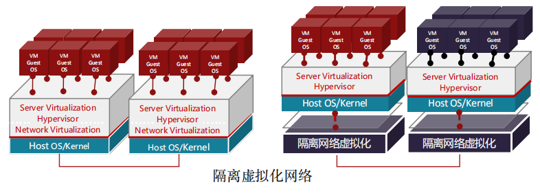 引入DPU智能网卡之后,将虚拟化网络的控制平面完全卸载到智能网卡 上,与主机操作系统相隔离。即使黑客攻陷了Hypervisor,获取了主机操作系统的root权限,也无法篡改虚拟化网络的配置,这样可以将黑客的攻击范围限制在 主机操作系统上,不会影响到虚拟化网络以及其它主机。进而达到了安全隔离的效果。