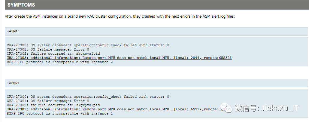 节点 1 ASM 日志,ORA-27303:additional information: Remote port MTU does not match local MTU. [local: 1500, remote: 9000] (169.254.1XX.XX8)。ORA-27301、ORA-27302、ORA-27303 这里看到主要问题了吧。继续看一下节点二日志。