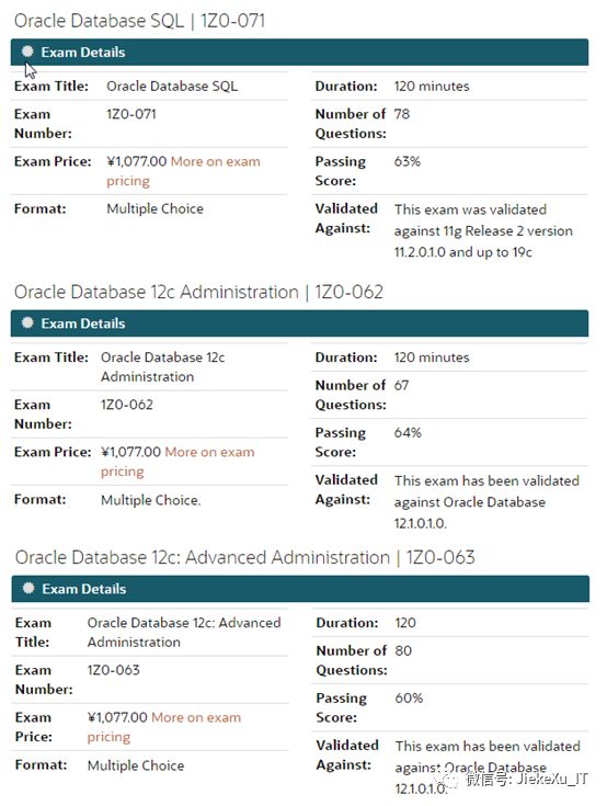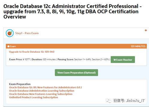 Oracle 12c OCP 认证考试则是目前主要的认证考试,也是需要先通过OCA 认证考试方可参加 OCP 考试,不过这里还有一种方式可以获取 12c OCP 认证考试,那就是通过升级考试 1Z0-060 Upgrade to Oracle Database 12c,意思就是说你已经考试通过了9i、10g、11g 等 OCP 认证考试。120分钟回答完 80 道选择题,正确率需为 64%-65% 即可。详细信息查看以下连接获取更多信息。