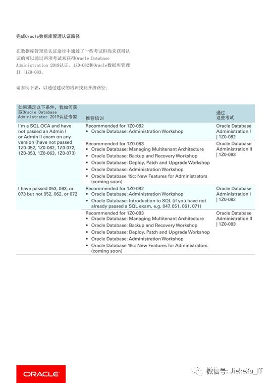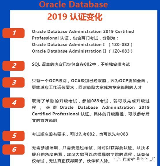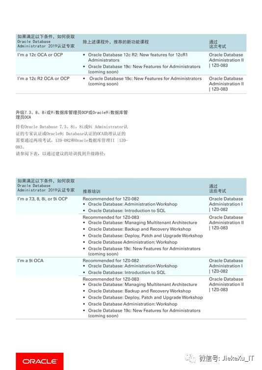 虽然前面说 11g OCP 停考了,但 Oracle 在 2019 年又发布了最新认证。新的认证体系会将年份最新的产品知识和技能纳入认证,比如 2019 OCP 会涉及到 12C,18C,19C 内容,并且不再绑定培训。综上只能比旧的体系更难,而且更加考察考生的知识更新与学习能力。
