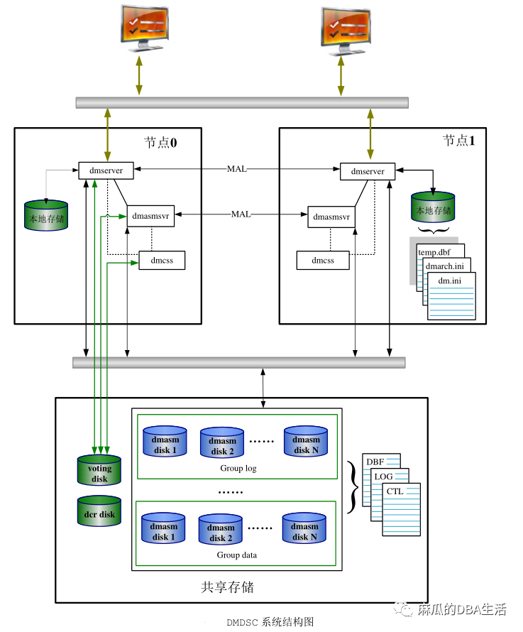 本地存储:DMDSC 集群中,本地存储用来保存配置文件(记录数据库实例配置信息的 dm.ini、dmarch.ini、dmmal.ini),本地归档日志、远程归档日志