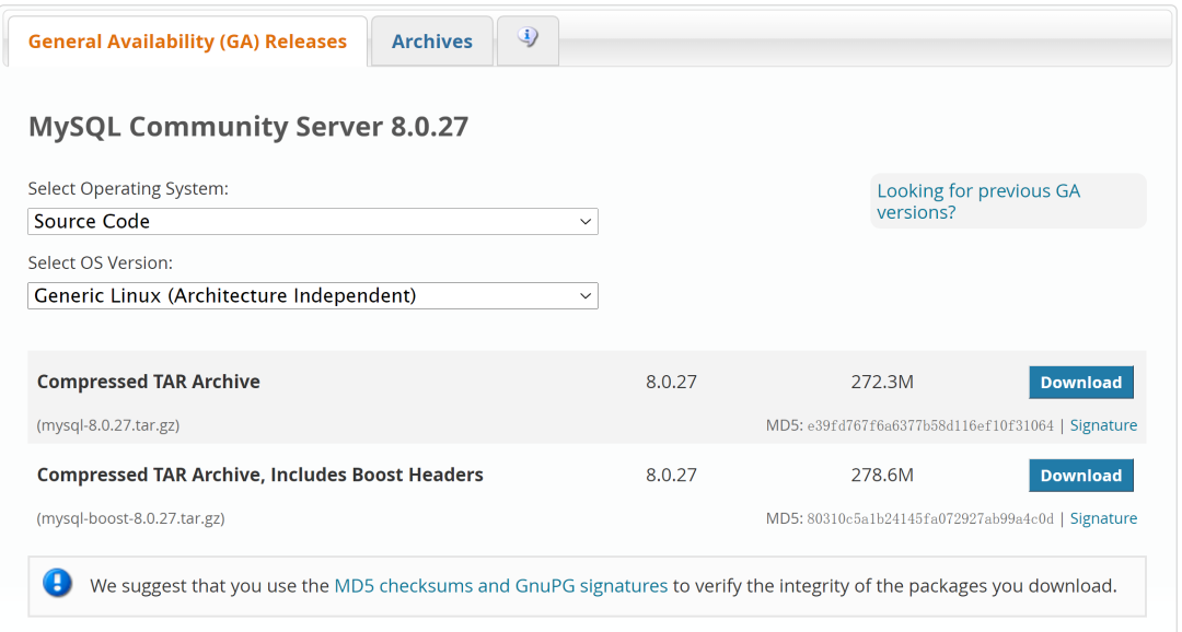 下载源码包,地址: https://dev.mysql.com/downloads/mysql/