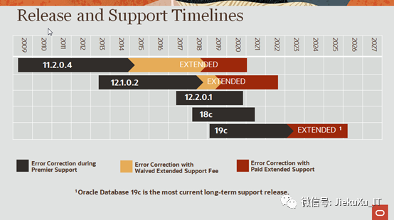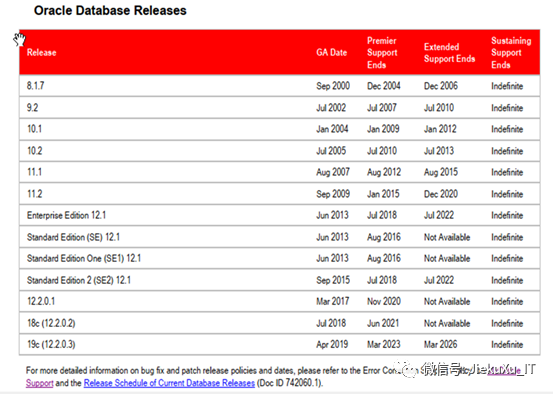 Oracle 12.2 的支持时间为 2026 年 5 月,这个版本只是单独指12.2.0.1 版本哦,18C 的Premier Support Ends (PS)截止日期为:20-Nov-2020for Patching,31-Mar-2023 for all other SupportOfferings;19C Extended Support Ends (ES)的截止时间为 31-Mar-2026。所以对于扩展支持而言选择 19C 是最好的选择,扩展周期最长希望看到本文的你会考虑到,能够尽早升级到新版本。