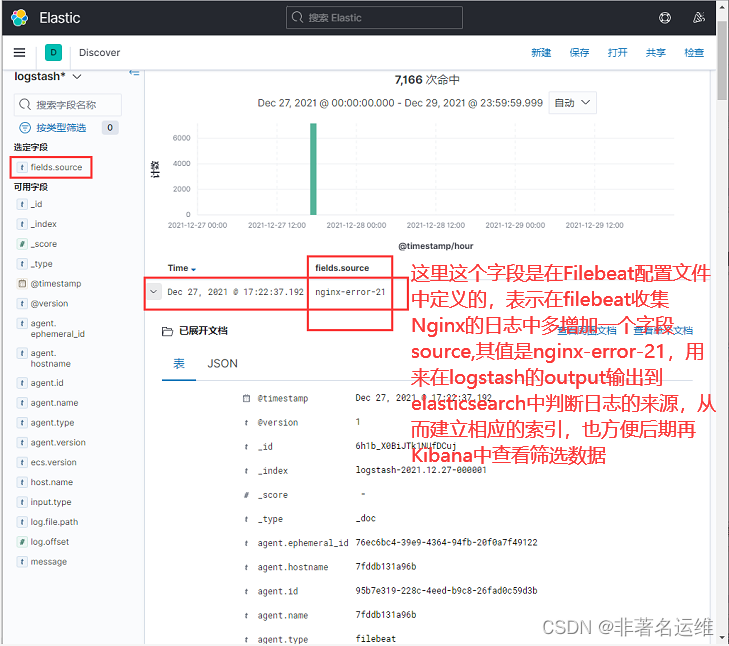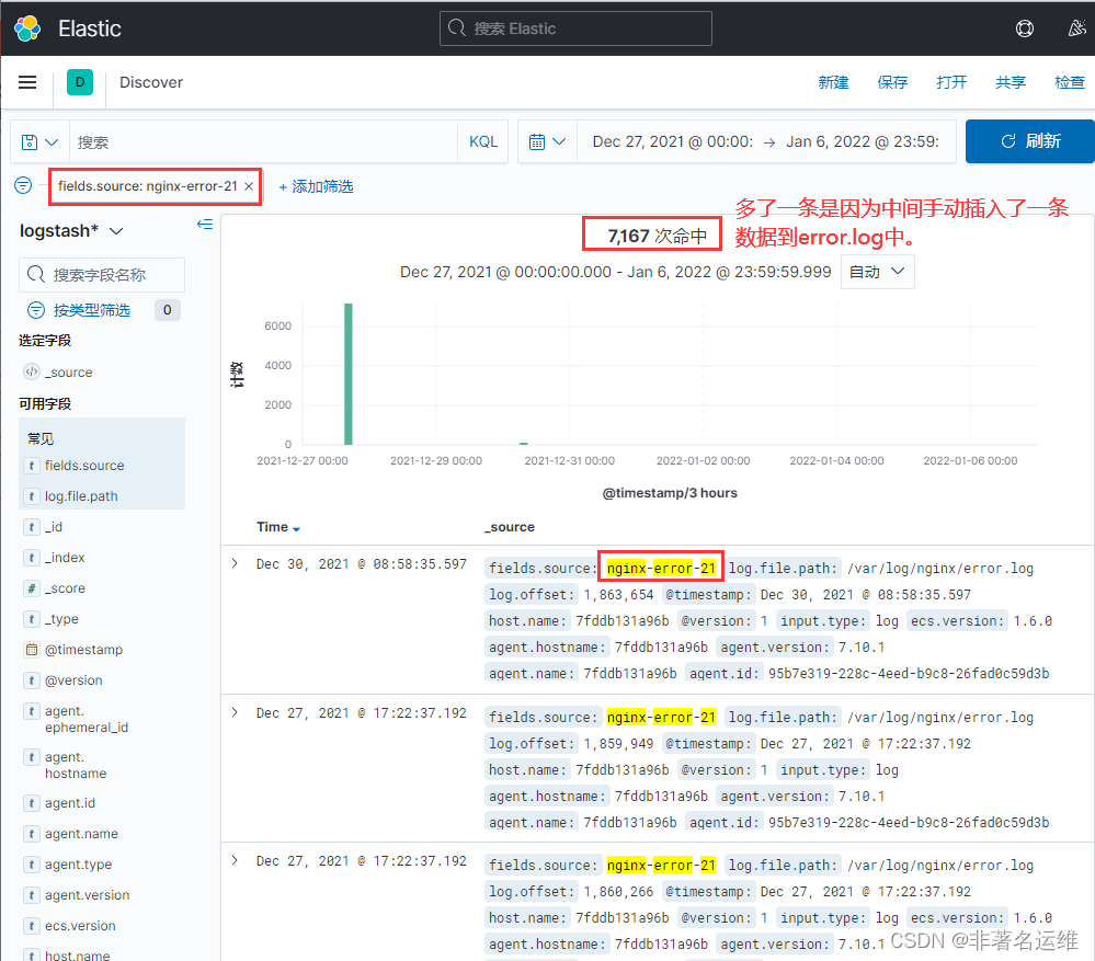 source: nginx-error-21 #额外的字段(表示在filebeat收集Nginx的日志中多增加一个字段source,其值是nginx-error-21,用来在logstash的output输出到elasticsearch中判断日志的来源,从而建立相应的索引,也方便后期再Kibana中查看筛选数据,结尾有图)