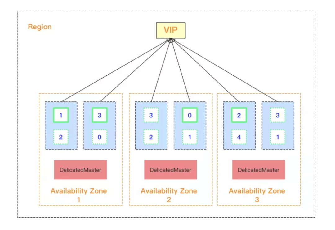 当选择三可用区部署时,会在每个可用区部署一个专用主节点,从而保障任何一个可用区不可用时,依然能够选出 Master 节点; 当选择双可用区部署时,为了避免出现一个可用区上分布两个专用主节点且出现“该可用区不可用”导致选不出 Master 节点的情况,腾讯云 ES 会选择一个隐藏可用区用来专门部署专用主节点。