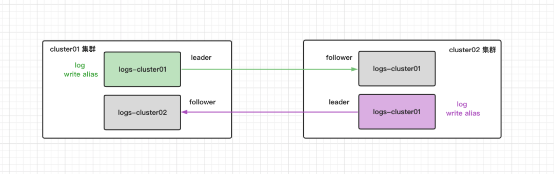 索引中的数据将会通过 CCR 跨集群复制从集群 cluster02 中获取;集群 cluster02 的别名设置相反。通过以上设置,应用程序在读写的时候都往 logs