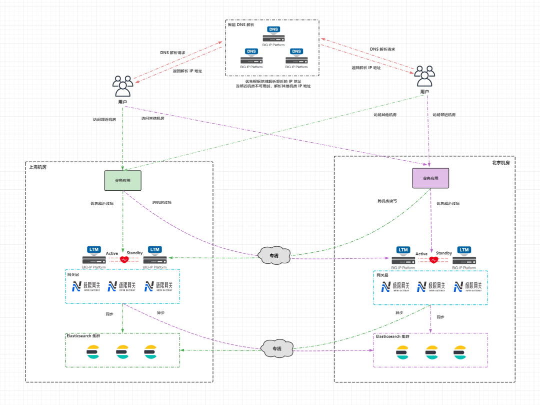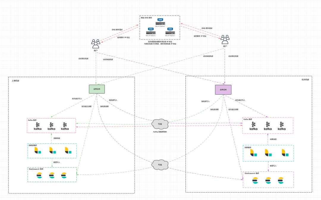 下图是双机房部署的一个整体架构图,在两个机房以双活的形式各部署一套 Elasticsearch 集群,同时对外提供服务,两个 Elasticsearch 集群配置 CCR 双向复制。机房之间的网络通过专线打通,用于承载 CCR 跨集群复制以及业务应用跨机房访问 Elasticsearch 集群的流量。业务应用的读写请求优先访问本机房的 Elasticsearch 集群,当本机房的集群出现不可用时,访问备机房的 Elasticsearch 集群。在公网部署一套智能 DNS 服务,根据用户的 IP 地址将域名解析到邻近用户机房的公网 IP,当整个机房出现故障时,才将域名解析到备机房的公网 IP。