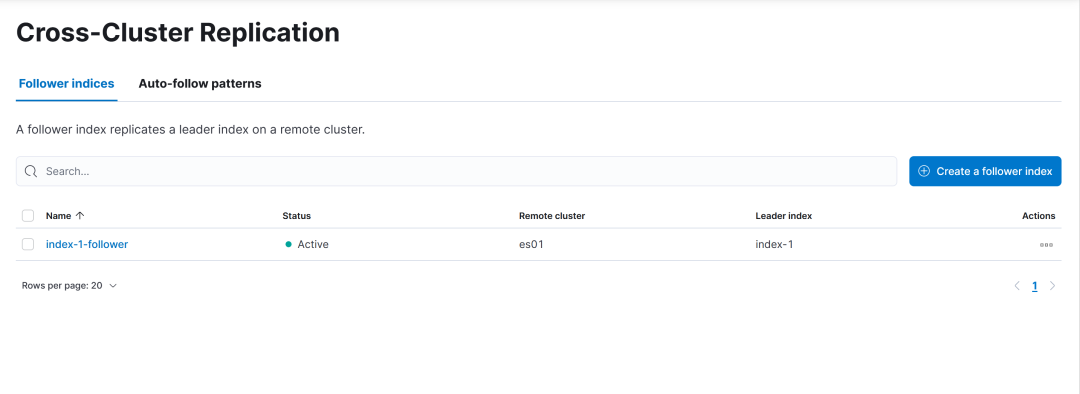 跨集群复制使用主动-被动模型(active-passive model),复制更改的索引称为“追随者索引”(follower Index),被复制的索引称为“领导者索引”(leader index)。当 leader index 收到写入时,follower index 会从远程集群上的 leader index 上基于文档操作实现订阅复制。当配置复制规则时,可以指定特定的索引进行复制;也可以通过 auto-follow pattern 以通配符的形式自动匹配多个索引,创建复制规则后新创建的索引也会自动匹配。