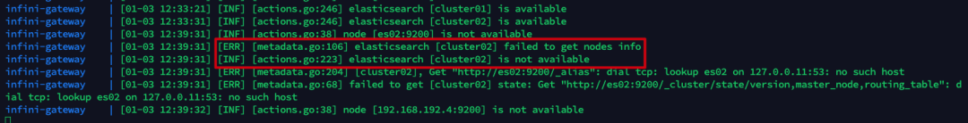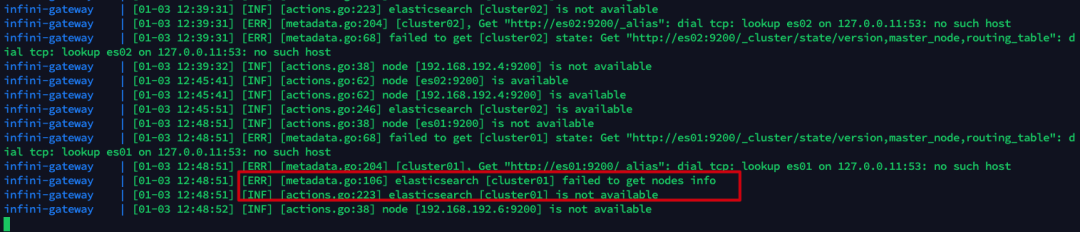 此时在极限网关上可以看到报错说 cluster01 集群不可用。