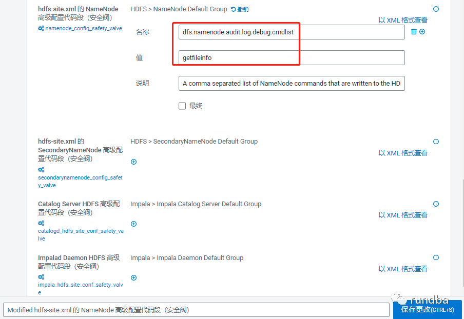 名称:dfs.namenode.audit.log.debug.cmdlist值:getfileinfo点击“保存更改”。
