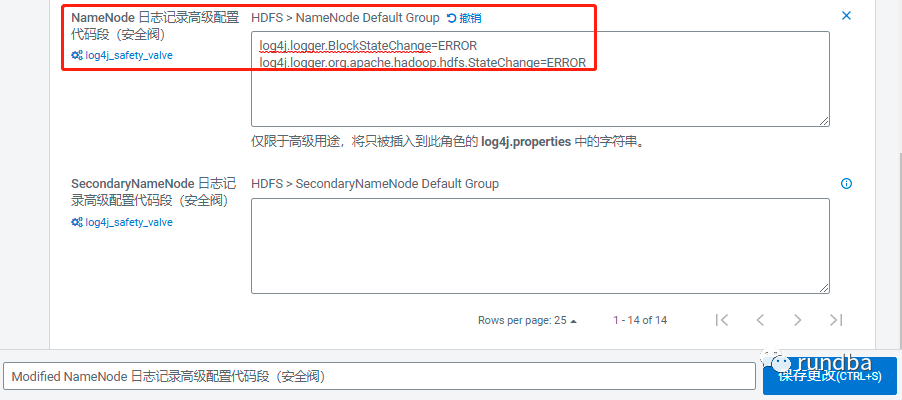 CM > 配置 > Configuration Search,搜索“namenode log”,找到“NameNode 日志记录高级配置代码段(安全阀)”,添加上面两行配置,点击“保存更改”。