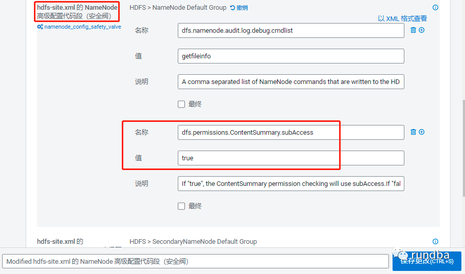 同样在“hdfs-site.xml 的 NameNode 高级配置代码段(安全阀)”,添加上述3处配置:
