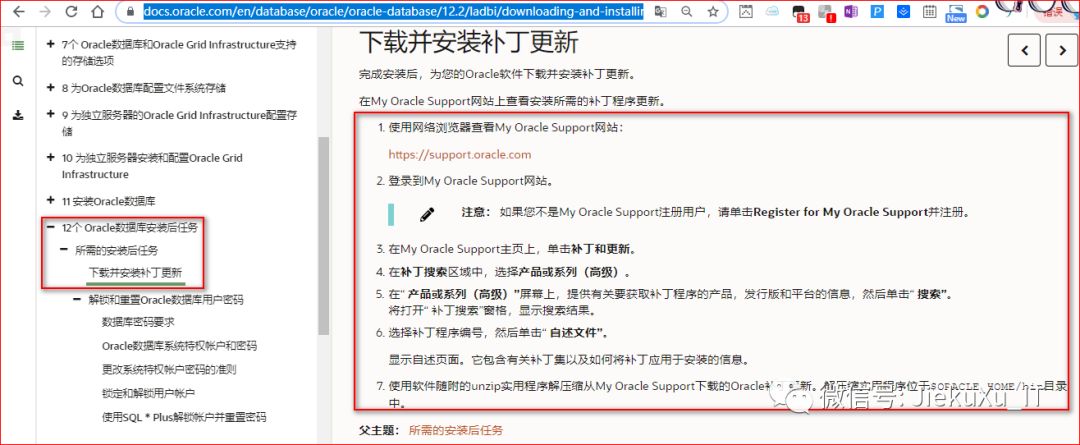 官方文档安装手册在第十二节中对于补丁下载更新有介绍,如下截图: