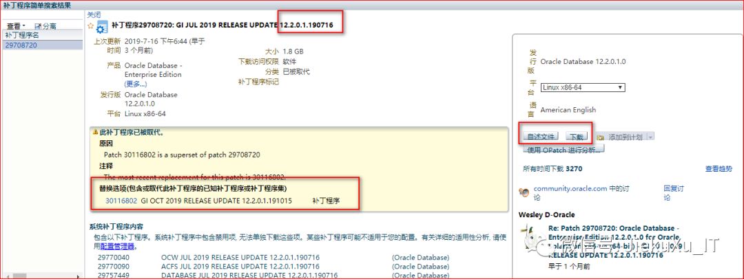 本次使用的补丁号为 p29708720,这是我国庆期间下载的补丁集,但是等我今天刚登陆上去查看时,第四季度的补丁也已经发布了,还可以免费下载,补丁号为 30116802。