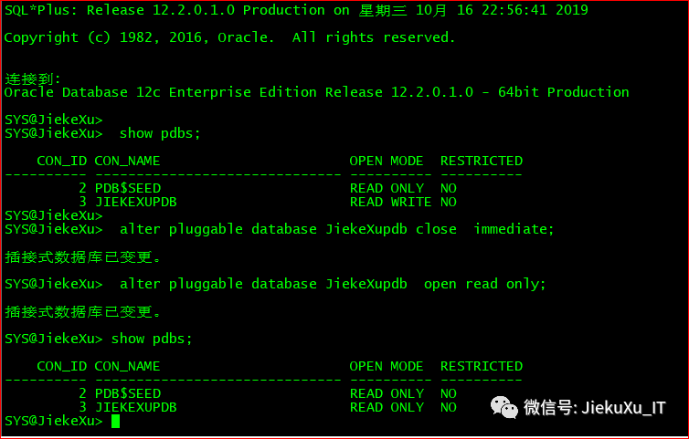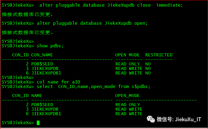 alter pluggable database JiekeXupdb close immediate;alter pluggable database JiekeXupdb open;show pdbs;select CON_ID,name,open_mode from v$pdbs;#alter pluggable database all open; #其实也可使用此命令打开所有的PDB,指定名称单独打开一个PDB