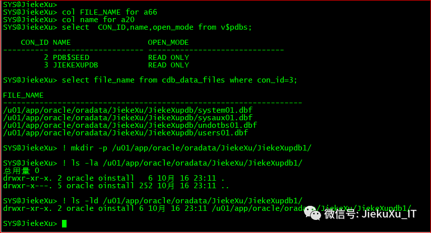 mkdir -p u01/app/oracle/oradata/JiekeXu/JiekeXupdb1/ls -ld u01/app/oracle/oradata/JiekeXu/JiekeXupdb1/