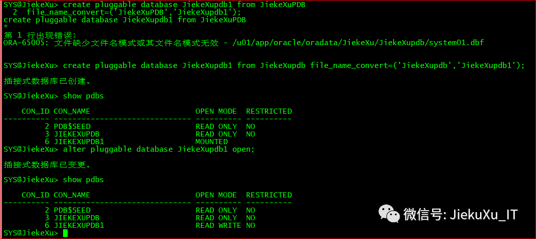 create pluggable database JiekeXupdb1 from JiekeXupdb file_name_convert=('JiekeXupdb','JiekeXupdb1');alter pluggable database JiekeXupdb1 open;