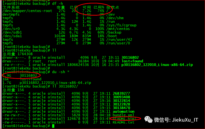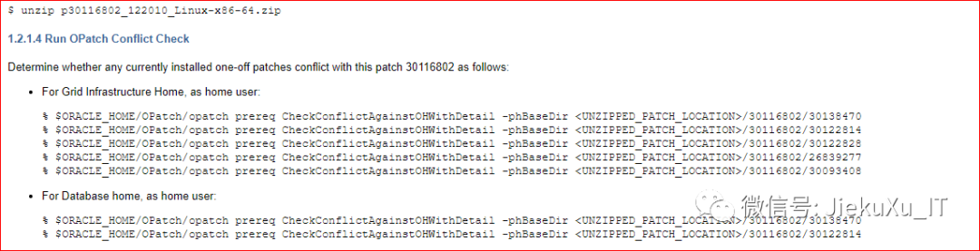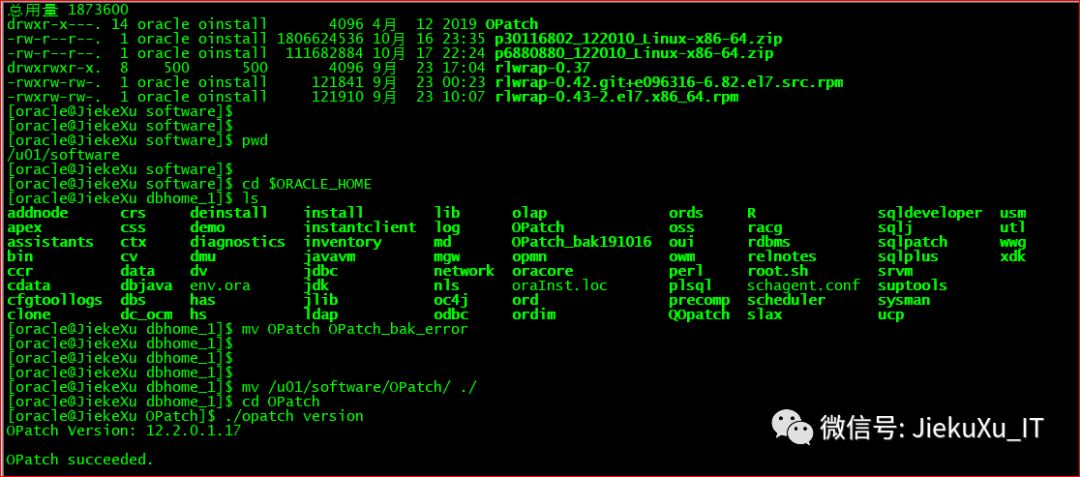 [oracle@JiekeXu software]$ unzip p6880880_122010_LINUX.zip[oracle@JiekeXu software]$ unzip p30116802_122010_Linux-x86-64.zip####删除 zip 包[root@JiekeXu software]# rm -rf p6880880_122010_LINUX.zip
