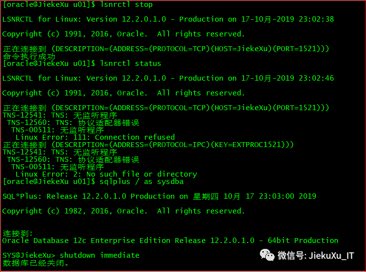 如果有应用连接,需要杀掉连接,然后停止监听,停止数据库。