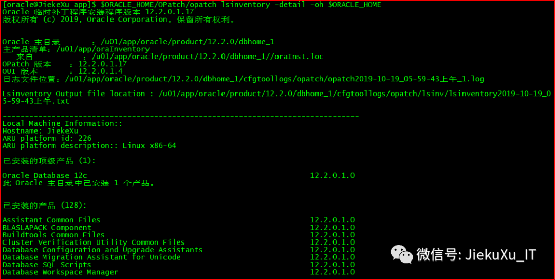 [oracle@JiekeXu dbhome_1]$ cd $ORACLE_HOME/OPatch[oracle@JiekeXu OPatch]$ ./opatch versionOPatch Version: 12.2.0.1.17OPatch succeeded.